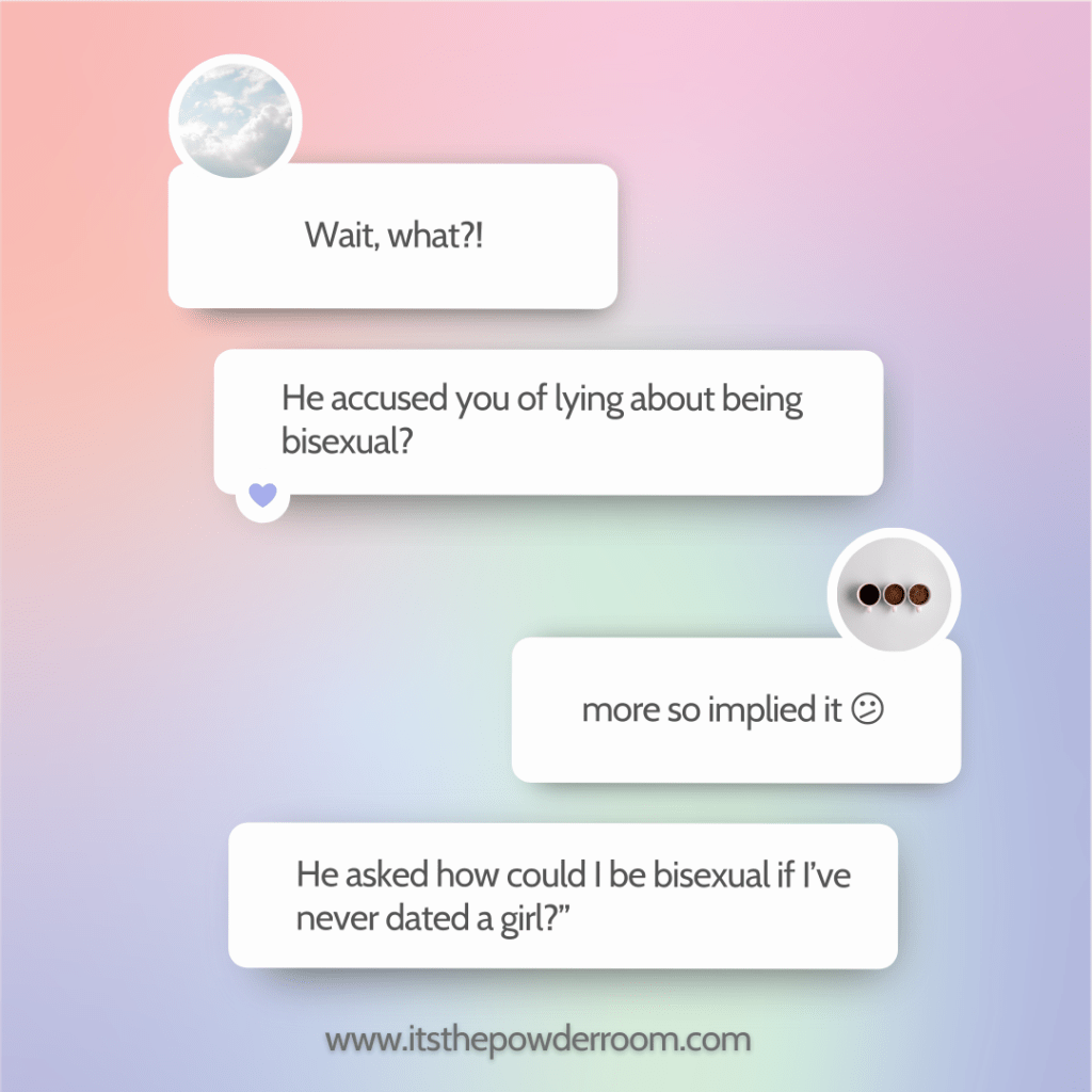 For a long time this made me wonder whether I’m only sexually attracted to women and not romantically or emotionally. If that’s the case, can I still be considered bisexual? Should I label myself as bicurious? (It eventually came to light that it wasn’t the case at all and in fact I just have trouble forming romantic connections with anyone but that is for another post). What I now wished I said was “if a straight man has never dated a woman does that make him gay and while we’re at it how is this any of your fucking business?”